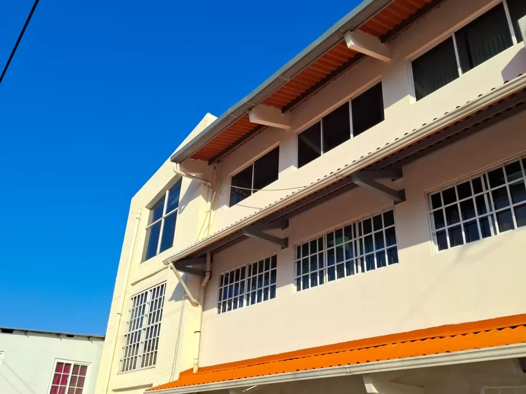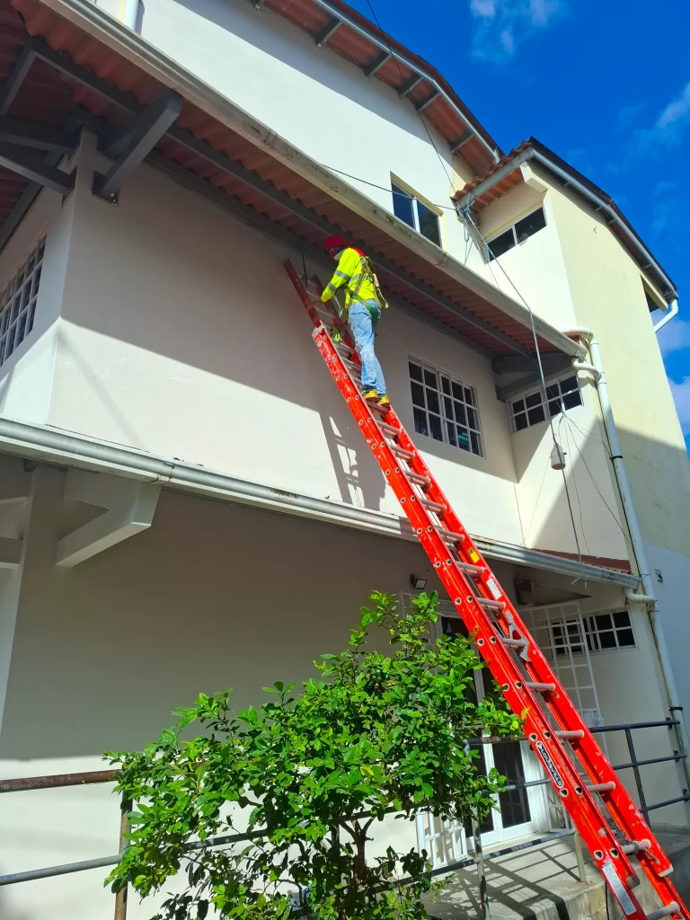 Nuestro alcance contempló la inspección de demoliciones de aceras deterioradas, la confección y vaciado de nuevas aceras, reparaciones de repellos y vanos de ventanas, pintura de techos y paredes, mantenimiento de verjas metálicas, instalación de nuevas puertas metálicas exteriores, limpieza general y otros trabajos en áreas externas del inmueble.